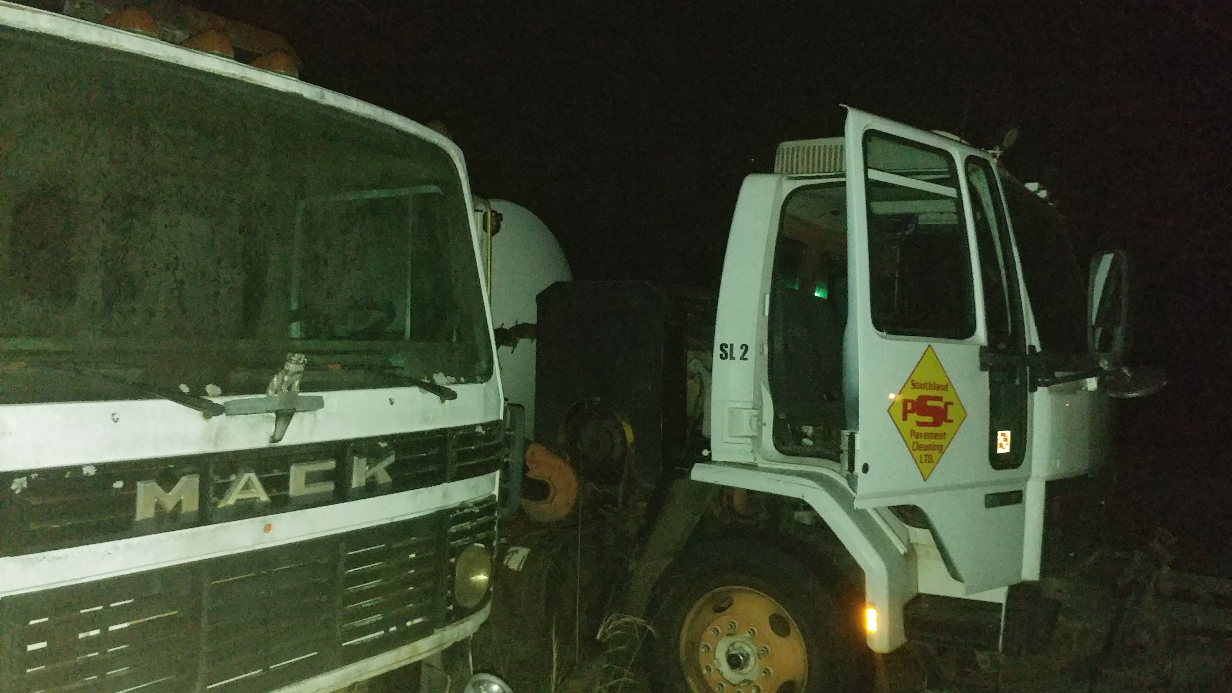 Field with a few abandoned street cleaning trucks.